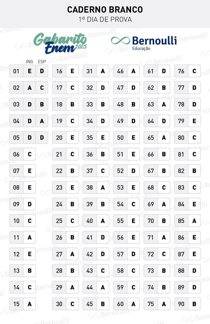 Gabarito extraoficial da prova Azul do Enem. Foto: Bernoulli Educação